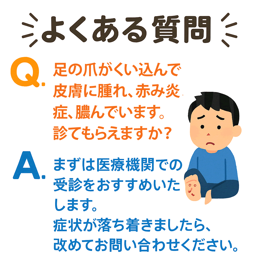 爪は・・・巻き爪、陥入爪、爪の肥厚などの正しい爪の切り方や、足の角質の付着を除去します。
